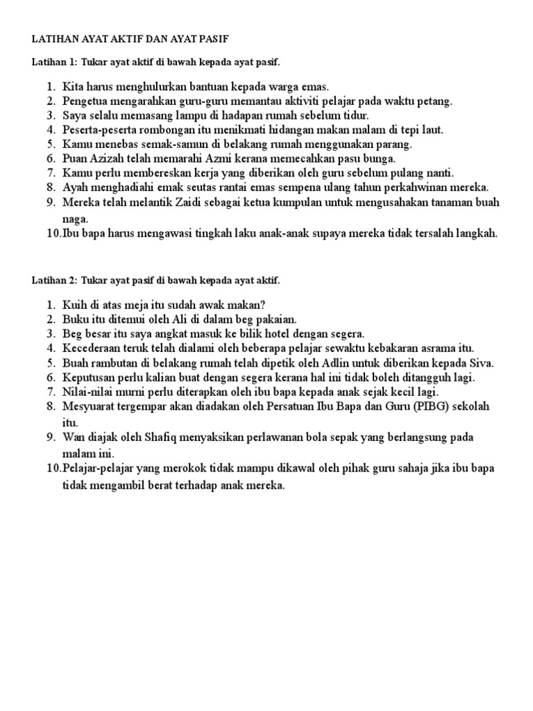 Kata kerja pasif dan ayat pasif dalam subjek bahasa melayu tahun 4. Encik sofiah membuat pinjaman bank untuk menjalankan projek penternakan ikan tawar. Beberapa orang pekerja sedang menebas semak samun di kiri dan di kanan lebur raya itu. Latihan tukar ayat aktif kepada ayat pasif. Ayat aktif ayat pasif & 2.