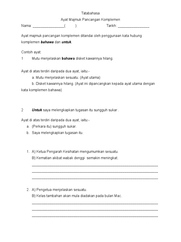 Cikgu shakirin 21 september 2020. Cara pembentukan ayat majmuk komplemen. Bahagian komplemen berfungsi sebagai unsur yang melengkapkan ayat tersebut. Ayat majmuk campurancampuran antaraayat tunggaldenganayat majmuk. Ayat komplemen ialah bahagian ayat dalam binaan ayat majmuk yang melengkapkan ayat tersebut. Ayat majmuk pancangan relatif aktiviti pengayaan. Ayat majmuk pancangan komplemen ialah ayat yang menggunakan kata hubung bahawa dan untuk. Ayat komplemen ditandai oleh penggunaan kata hubung komplemen bahawa dan untuk.contohnya: Mahat menyatakan bahawa dia akan pulang esok. Sintaksis ayat majmuk pancangan keterangan. Percobaan pelemparan sebuah mata uang. Ketua pengarah kesihatan mengumumkan bahawa. Oleh sebab itu klausa komplemen adalah klausa yang.